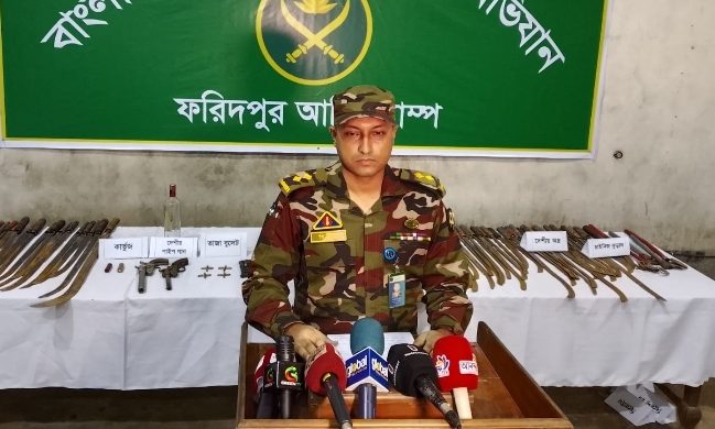তি‌নি জানান,আসন্ন জাতীয় নির্বাচনকে সামনে রেখে দেশের আইন-শৃঙ্খলা পরিস্থিতি স্বাভাবিক রাখতে ফরিদপুরে বিশেষ অভিযান পরিচালনা করে বাংলাদেশ সেনাবাহিনী বিপুল পরিমাণ অবৈধ অস্ত্র ও গোলাবারুদ উদ্ধার করেছে।